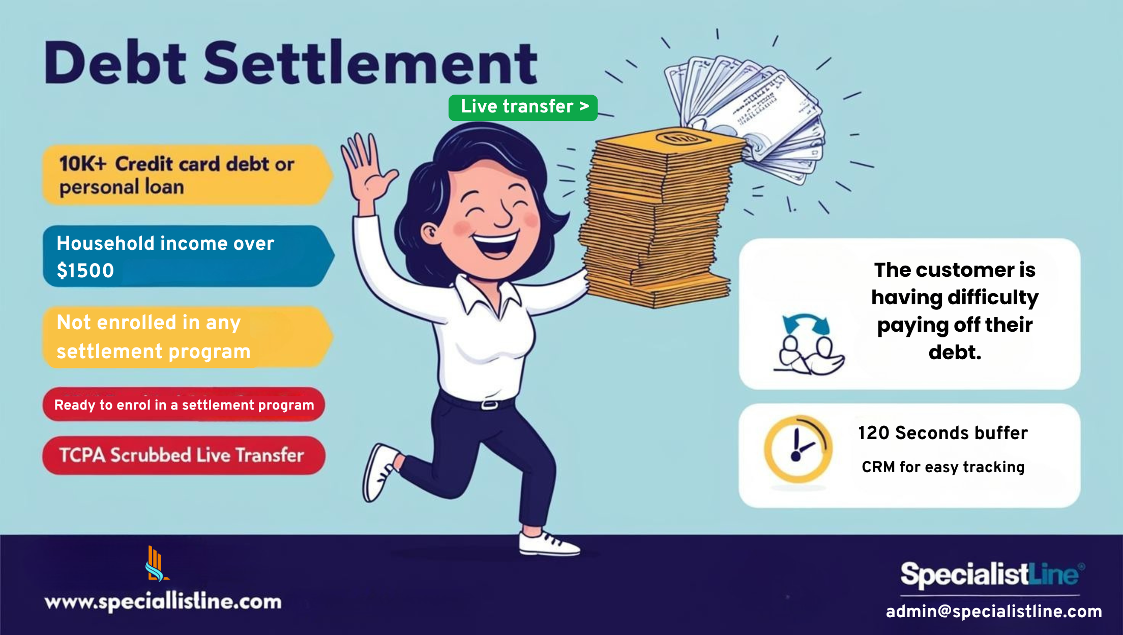 Stop wasting time on cold leads! At Specialist Line, we provide exclusive, high-intent live transfers for Debt Settlement, so you can focus on closing deals instead of chasing dead ends!